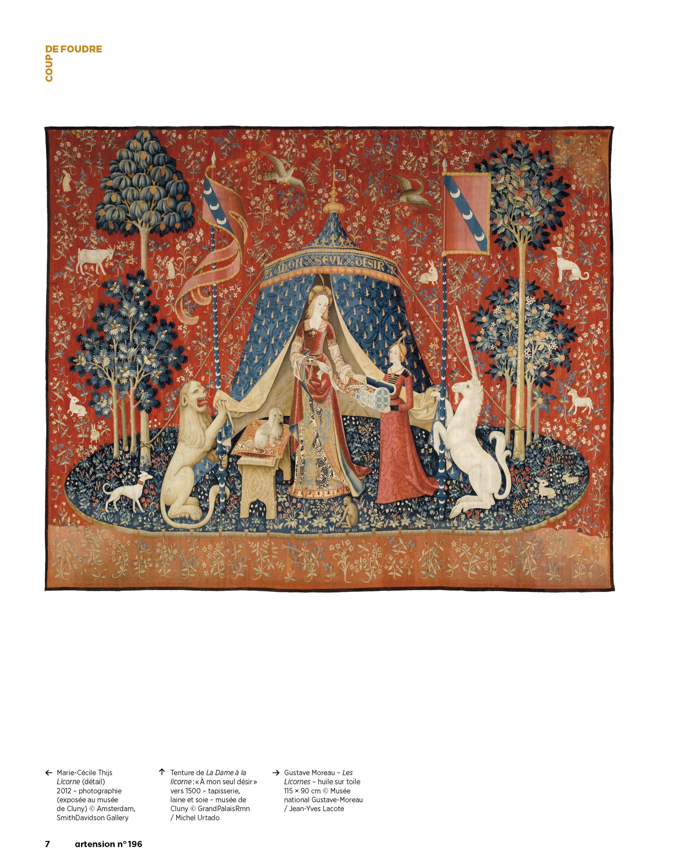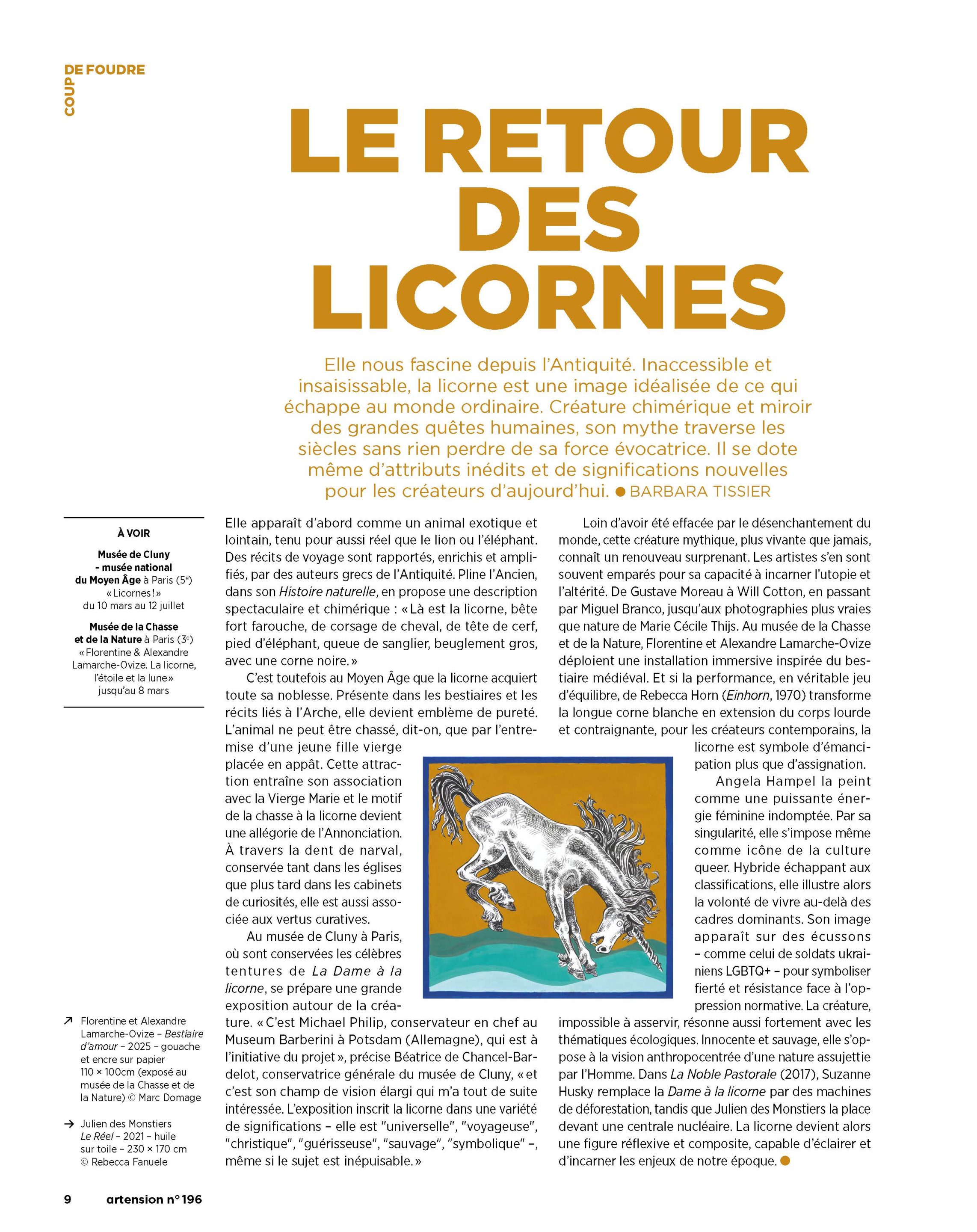 La licorne n’est pas qu’un fantasme naïf. Barbara Tissier retrace comment ce mythe millénaire, des tapisseries médiévales aux créations les plus récentes, s’est chargé de sens nouveaux : émancipation féminine, culture queer, résistance écologique. Angela Hampel, Rebecca Horn, Florentine et Alexandre Lamarche-Ovize s’en emparent avec une vigueur qui surprend. Et le musée de Cluny lui consacre une grande exposition dès ce printemps.