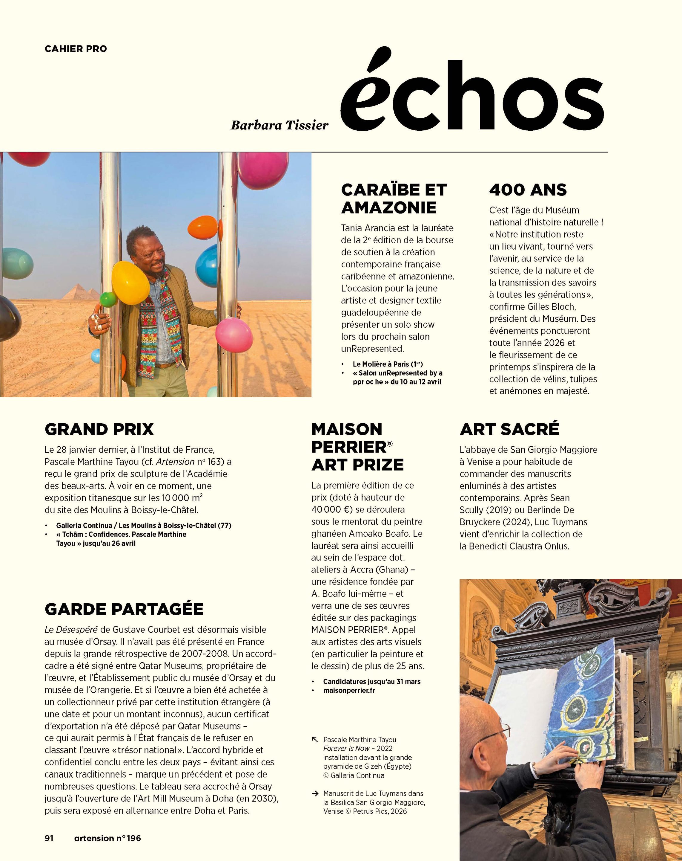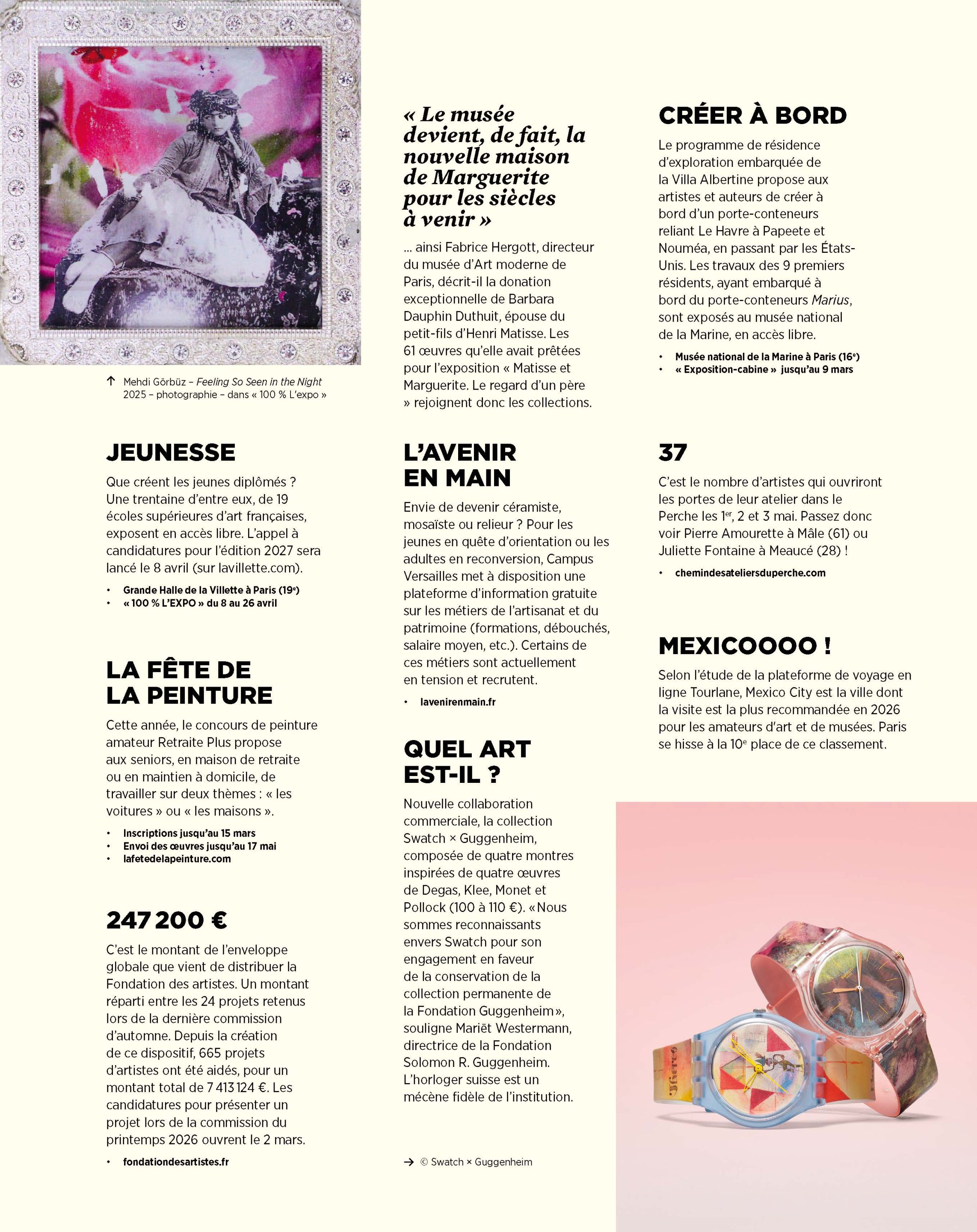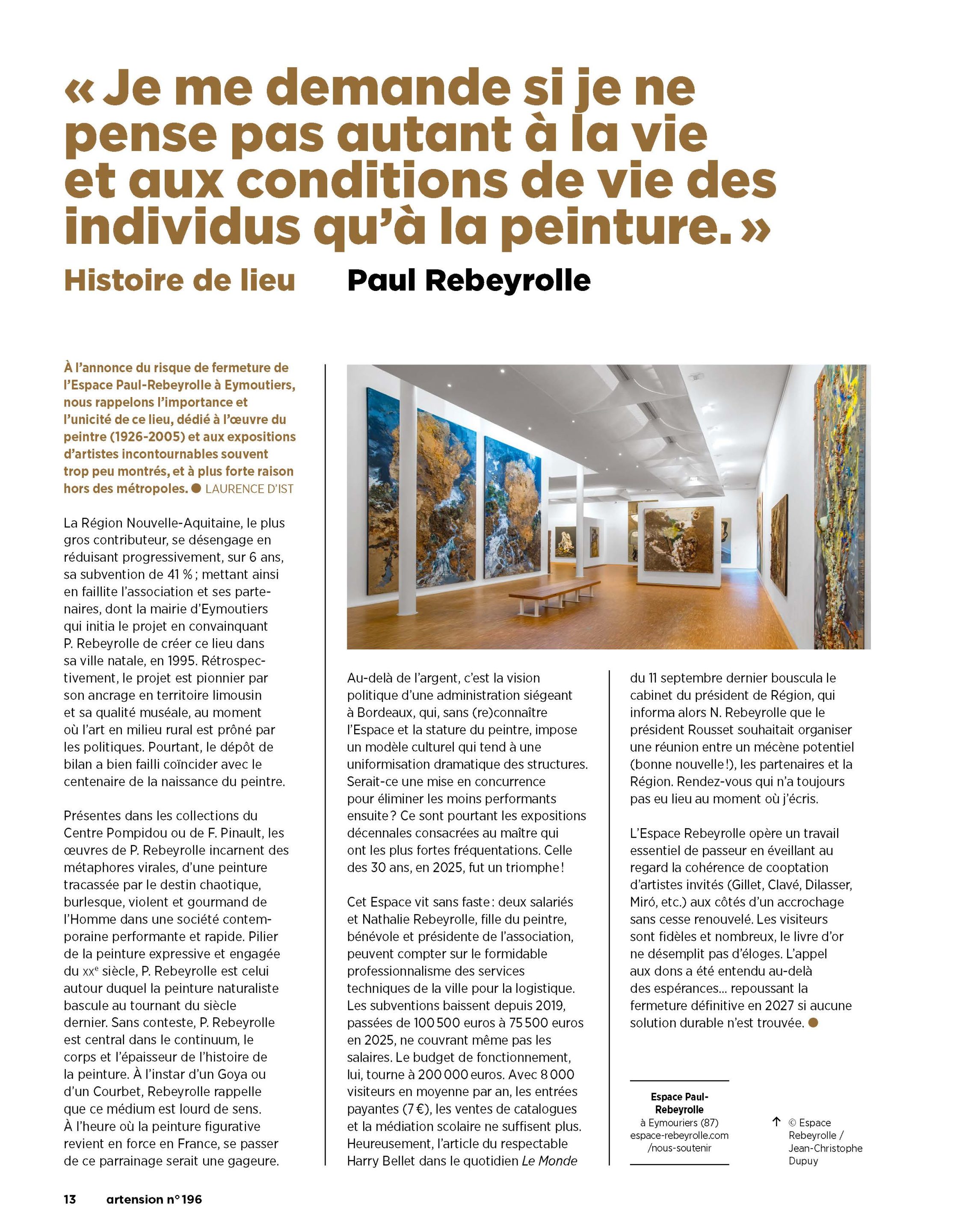 L’Espace Paul-Rebeyrolle, musée dédié au peintre expressif Paul Rebeyrolle (1926-2005) à Eymoutiers, risque de fermer en 2027 faute de financement suffisant. À Strasbourg, Marc et Marie-Luce Arbogast ont constitué depuis 1975 la plus importante collection vodou de la planète : 1 500 objets dans un château d’eau. À Miami, la scénographe Es Devlin a présenté à Art Basel une bibliothèque-sculpture de 2 500 livres.
