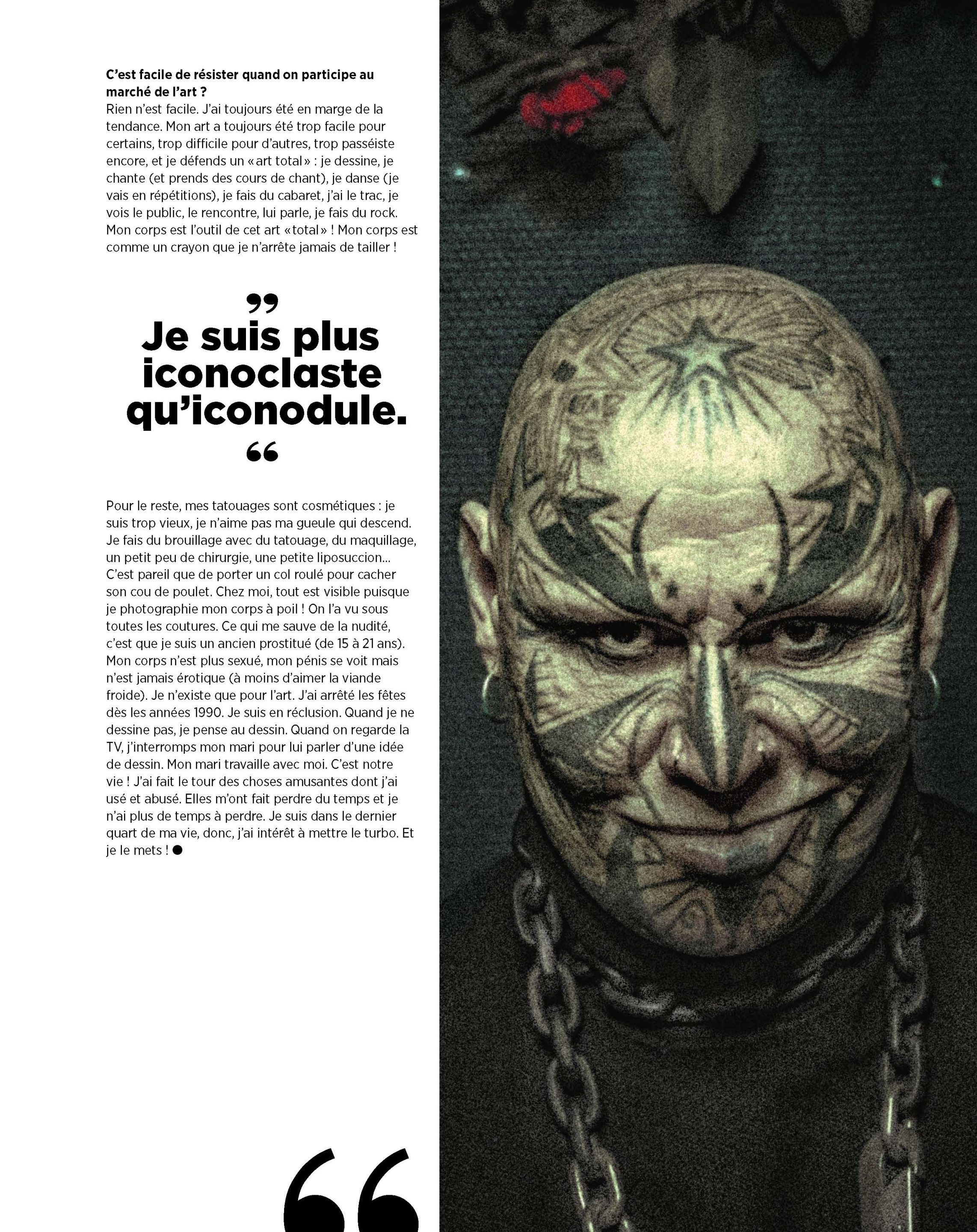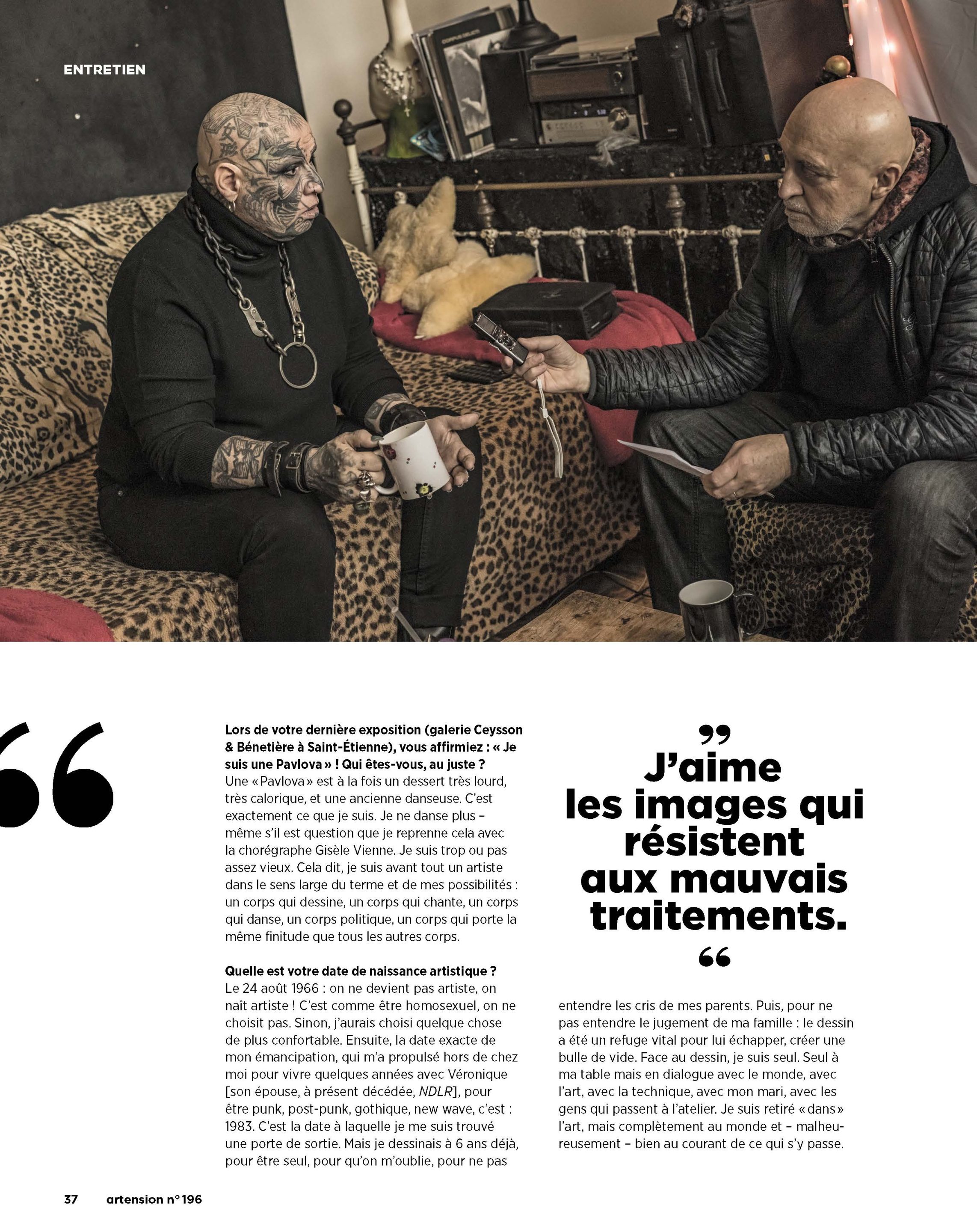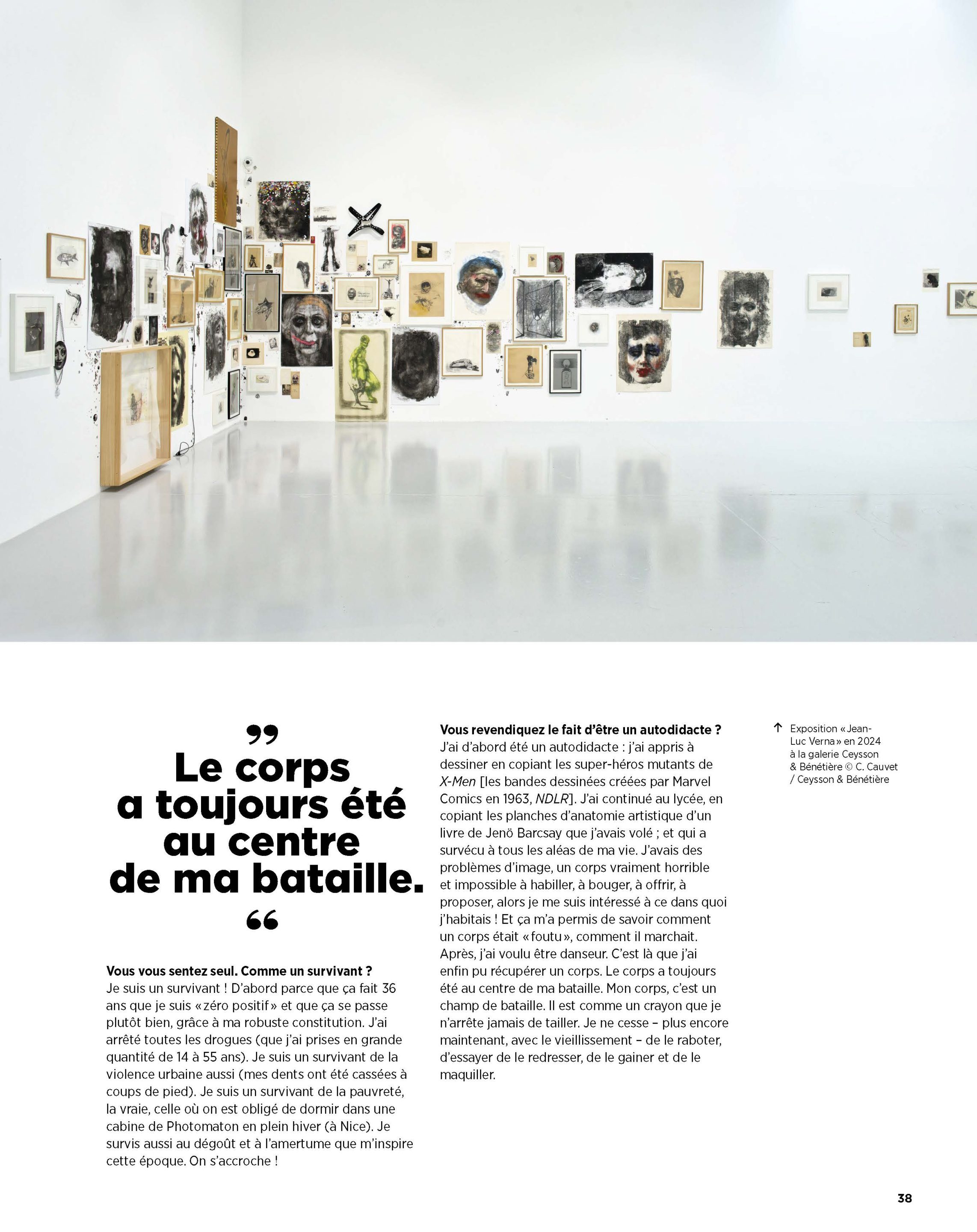 Un dessin, ça hurle. Jean-Luc Verna le vit depuis l’enfance : survivant de la violence, de la drogue, séropositif depuis 36 ans, il a fait de son corps tatoué jusqu’au visage un champ de bataille et une œuvre. Punk, danseur, chorégraphe, il revendique un art qui résiste à tout. Jean-Jacques Gay l’a rencontré, Thierry Borredon l’a photographié. Ça ne ressemble à rien d’autre
