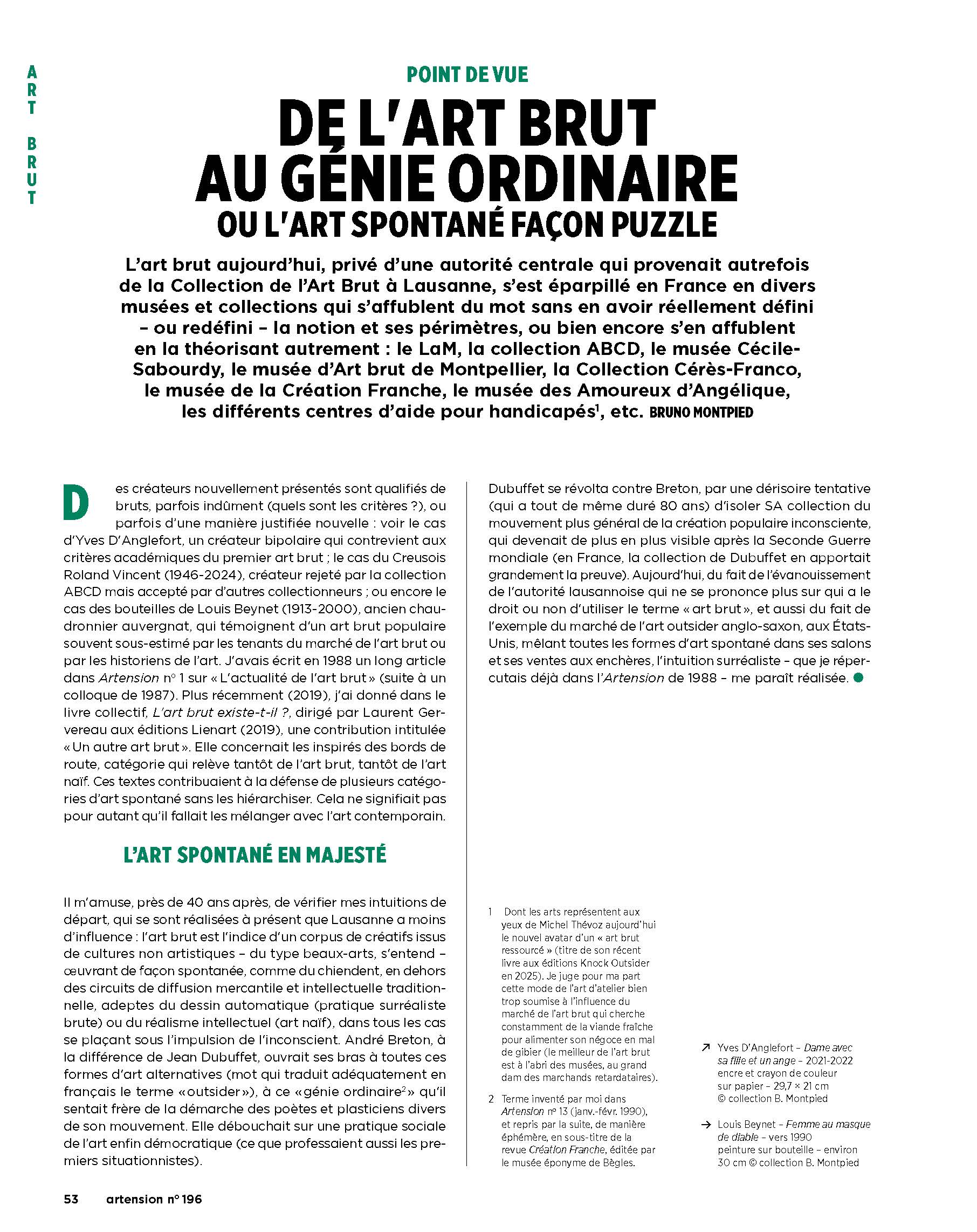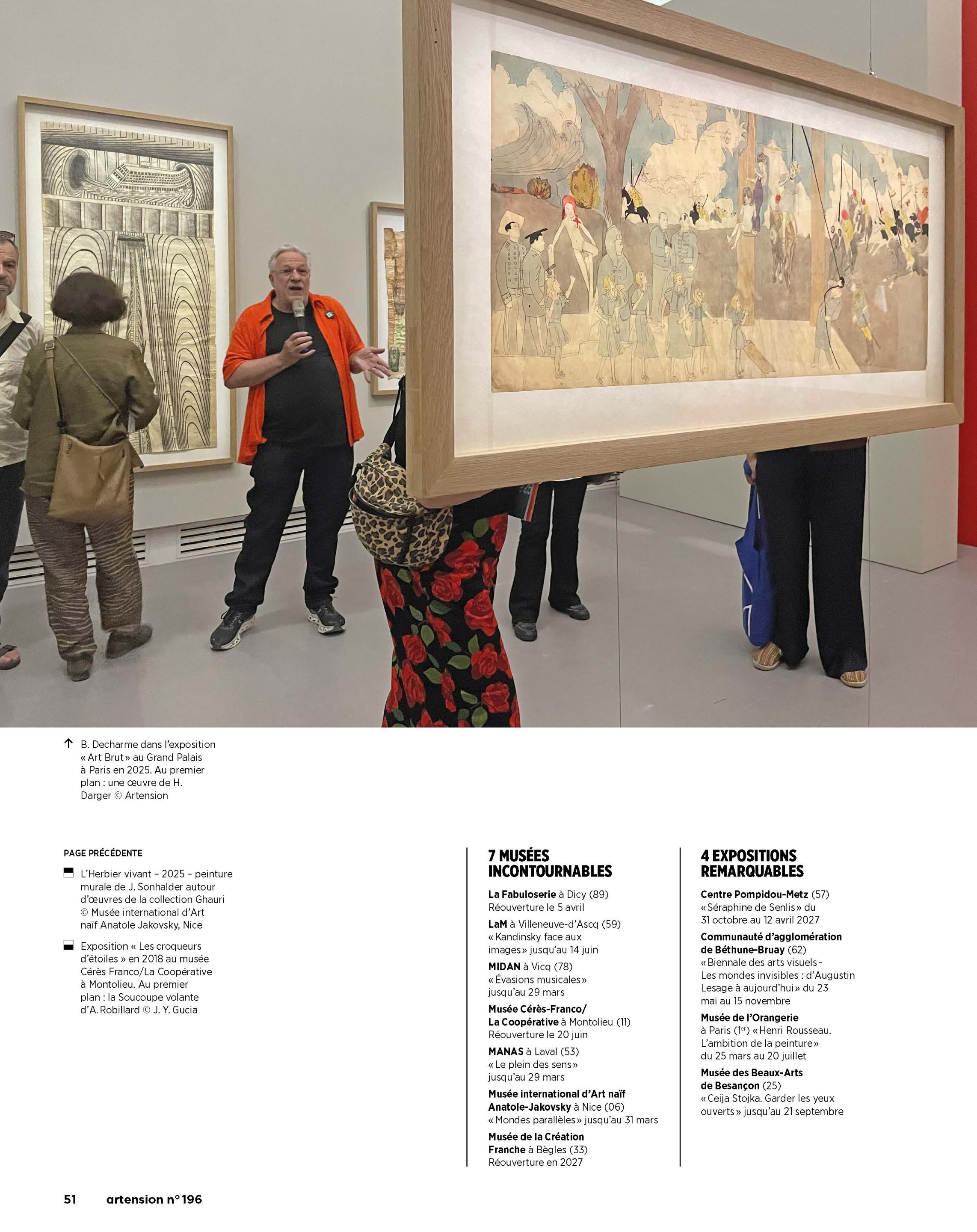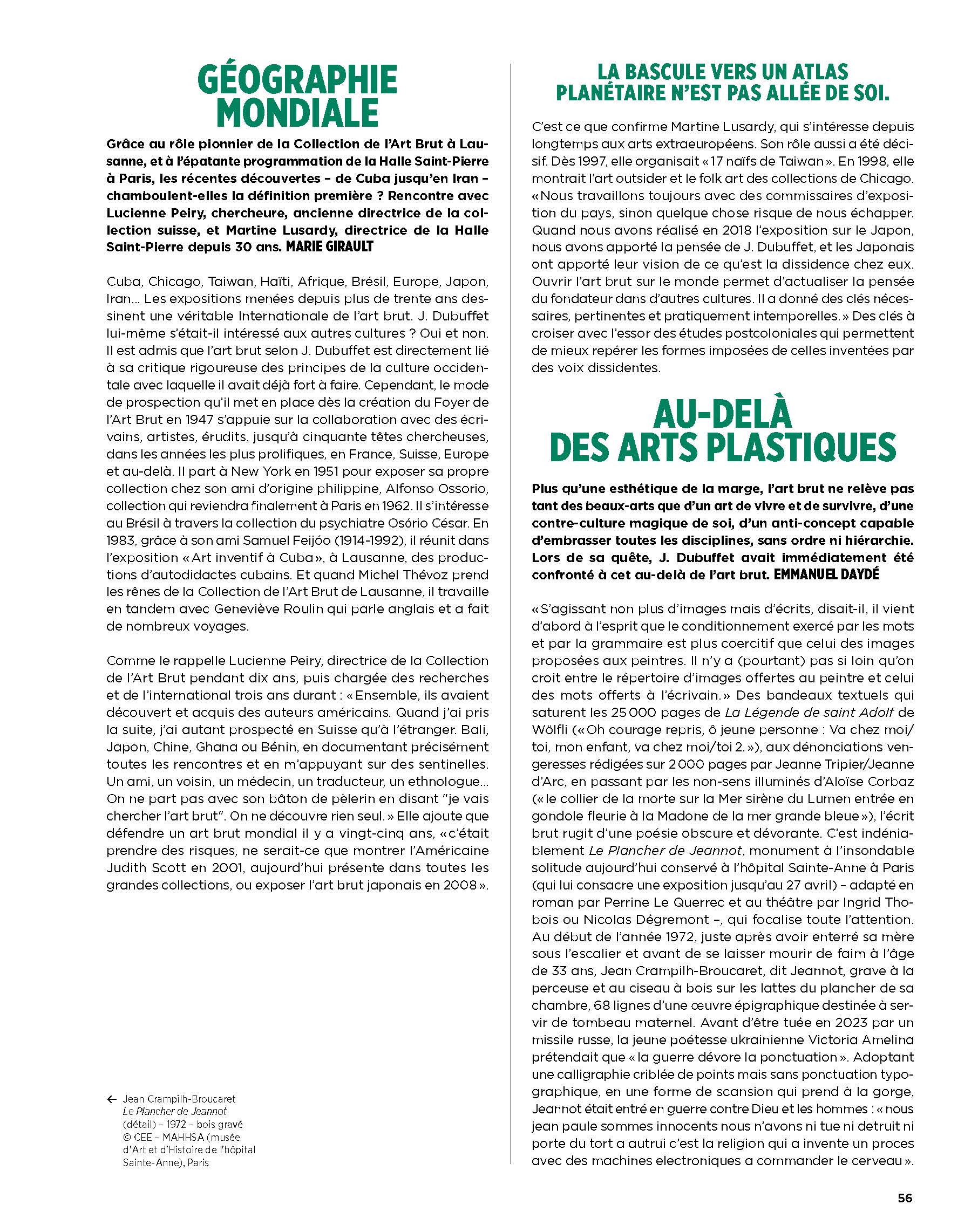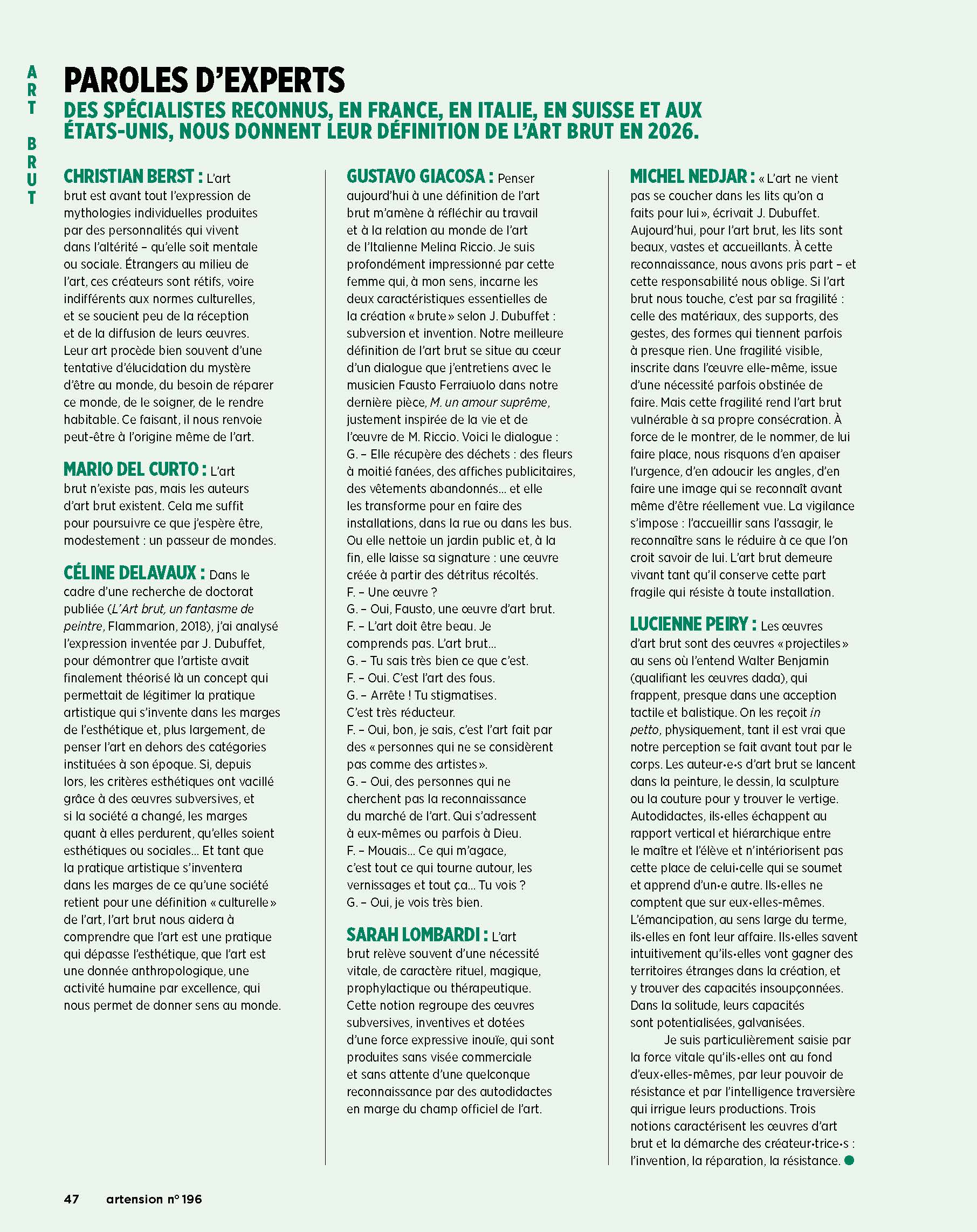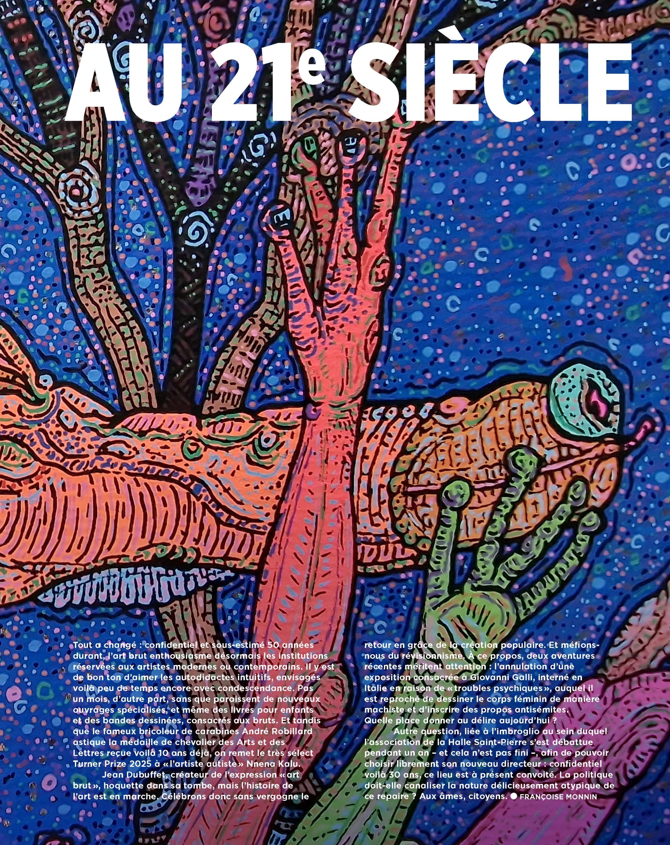 Consacré, contesté, convoité : l’art brut a 50 ans, et les questions n’ont jamais été aussi vives. Qui a le droit de définir le « brut » ? Comment les musées l’accueillent-ils sans le trahir ? Qu’en est-il du marché ? Artension part sur tous les fronts : une collection mythique à Lausanne, Dubuffet redécouvert, une géographie mondiale, des créateurs inclassables et des ateliers participatifs qui changent tout.