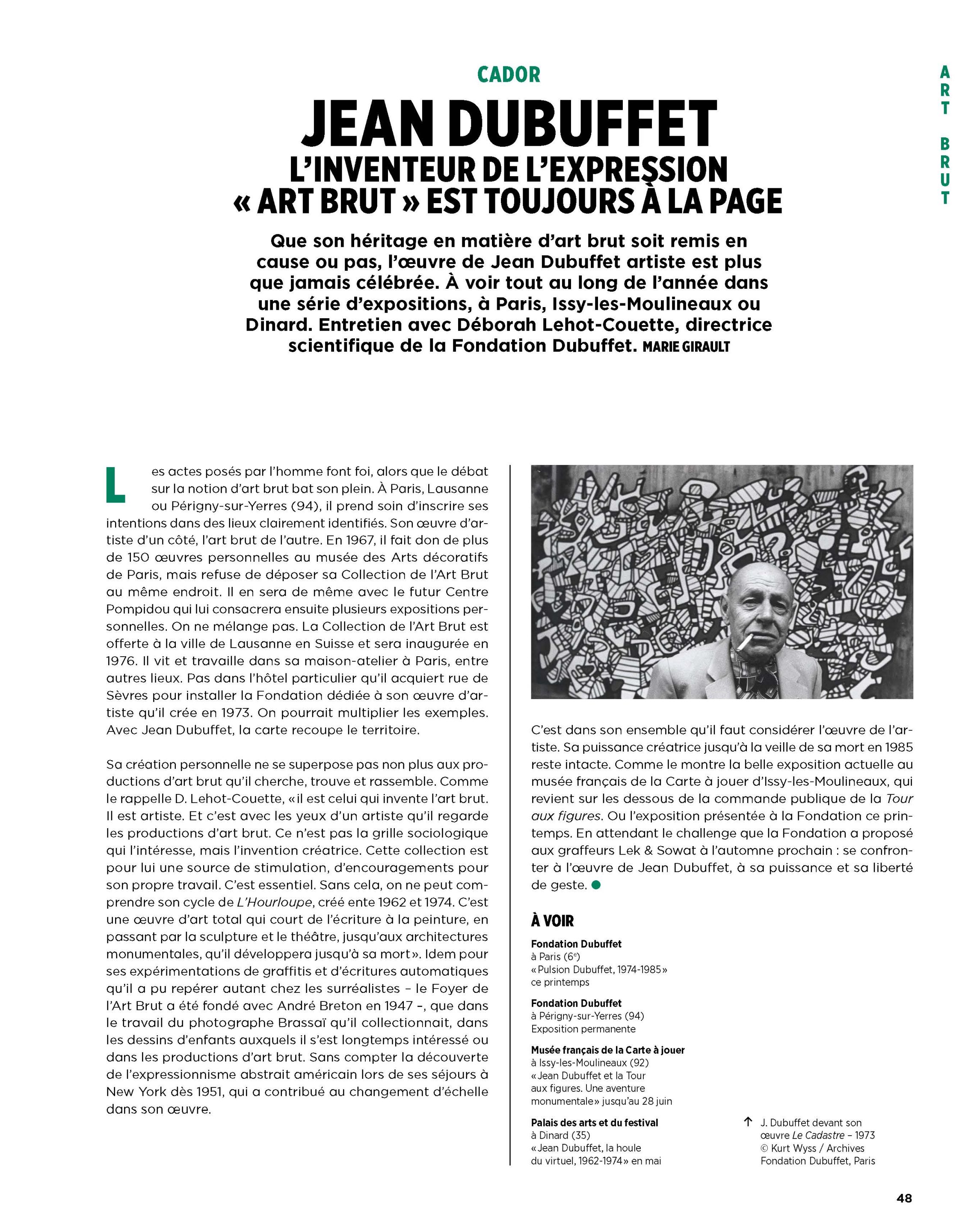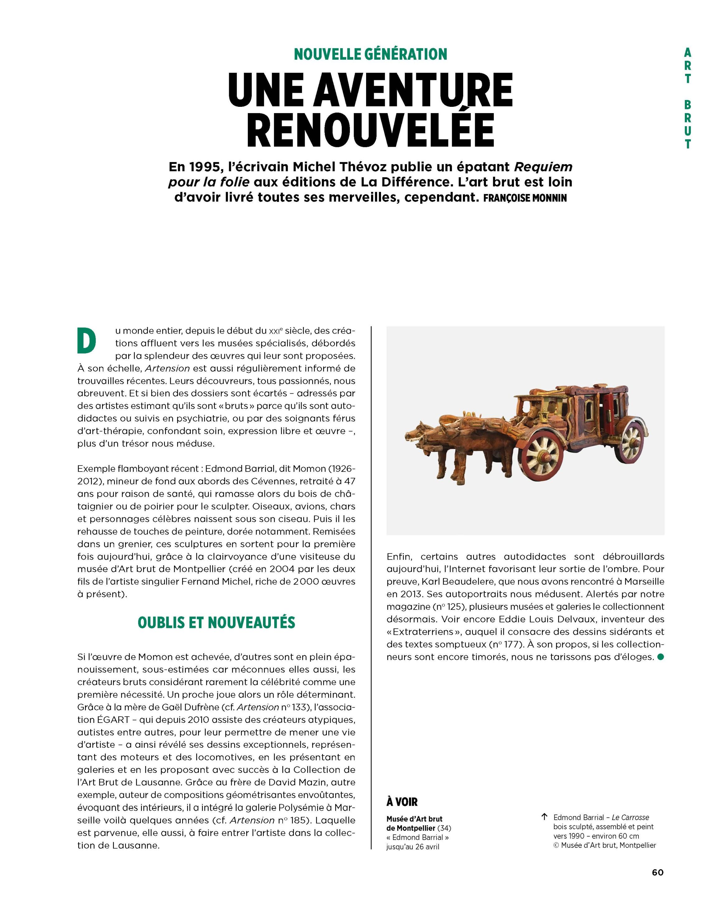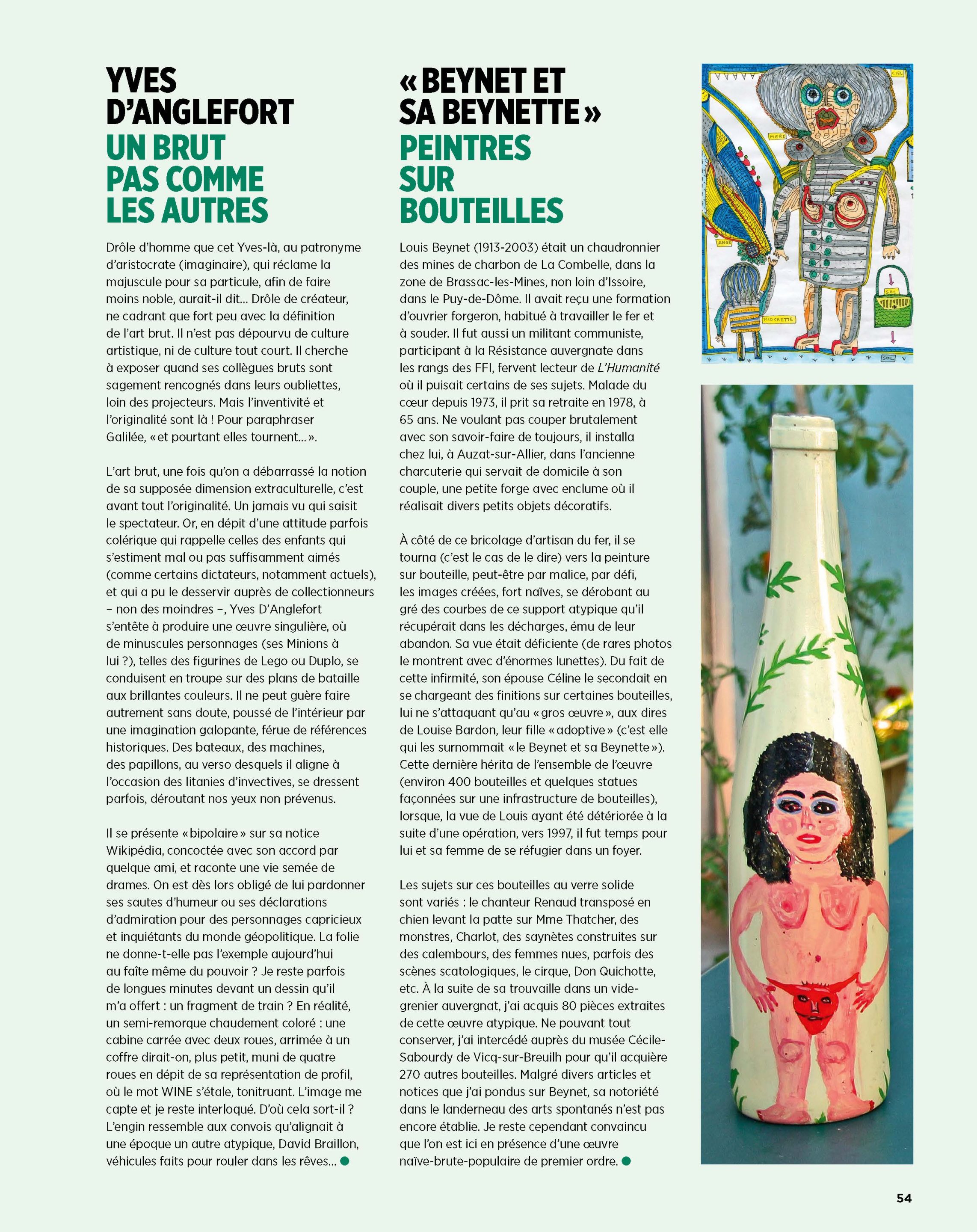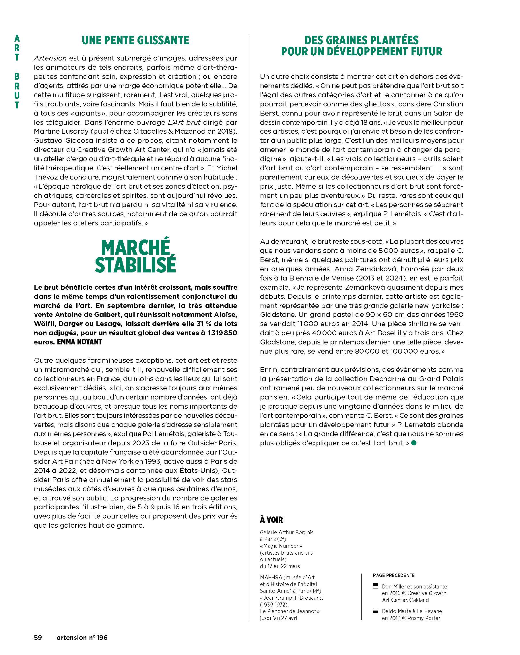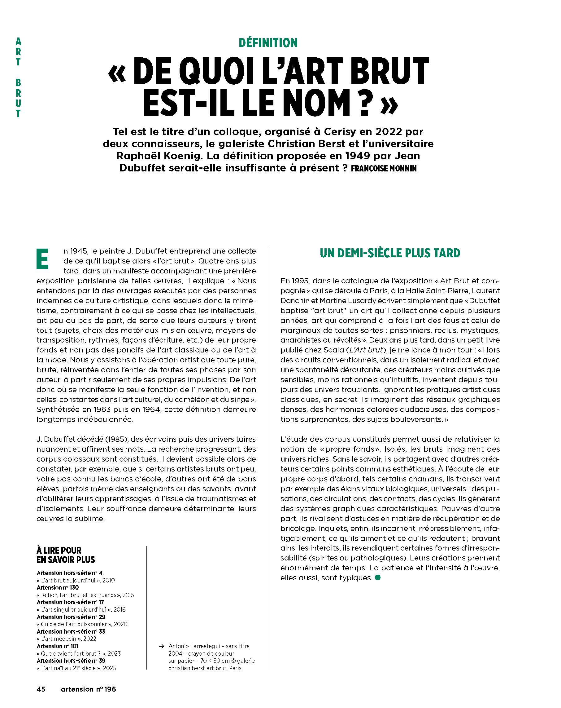 Consacré, contesté, convoité : l’art brut a 50 ans, et les questions n’ont jamais été aussi vives. Qui a le droit de définir le « brut » ? Comment les musées l’accueillent-ils sans le trahir ? Qu’en est-il du marché ? Artension part sur tous les fronts : une collection mythique à Lausanne, Dubuffet redécouvert, une géographie mondiale, des créateurs inclassables et des ateliers participatifs qui changent tout.
