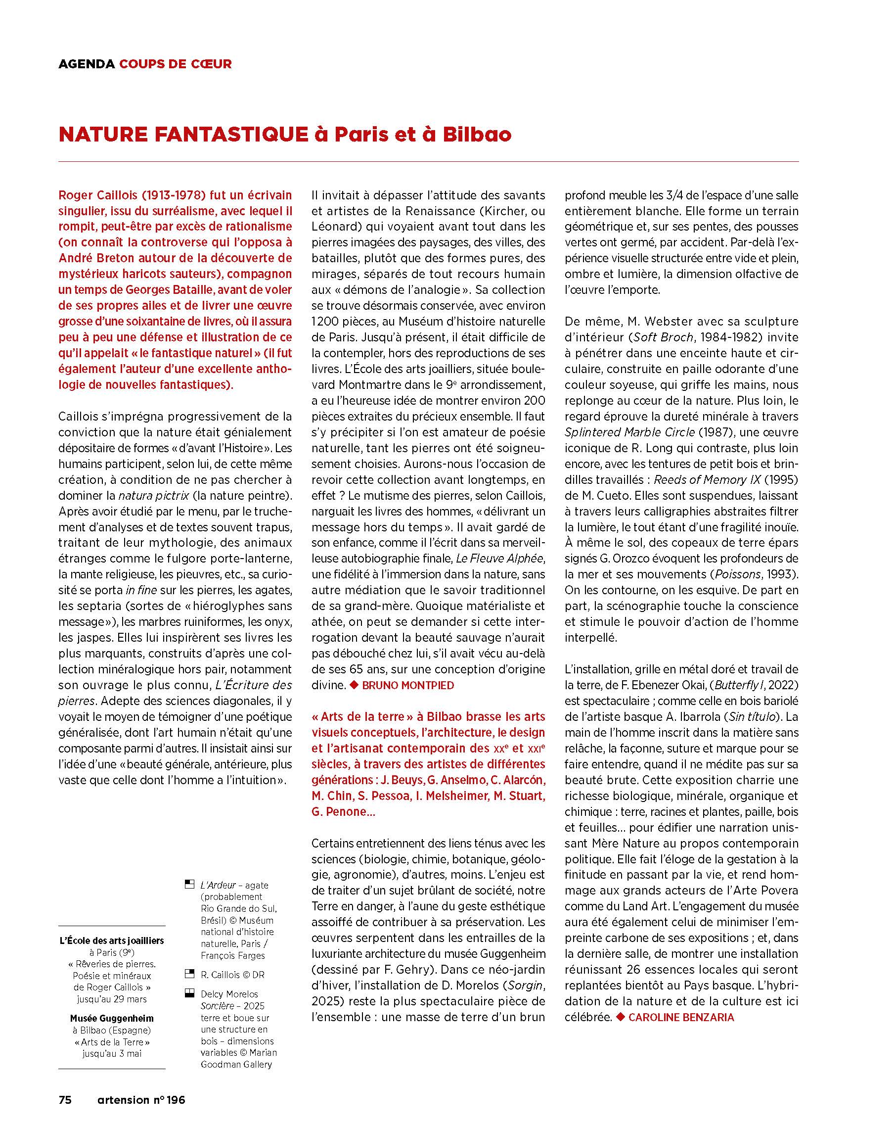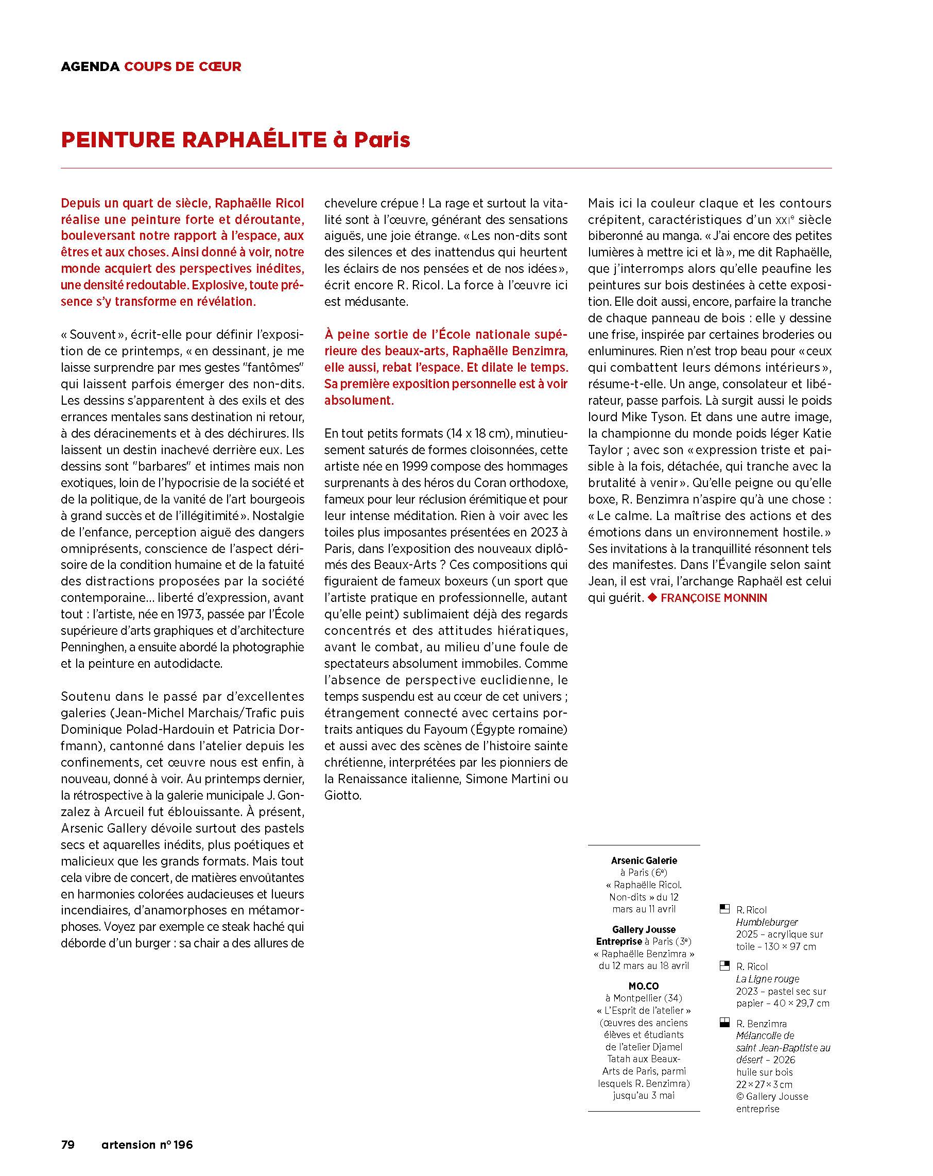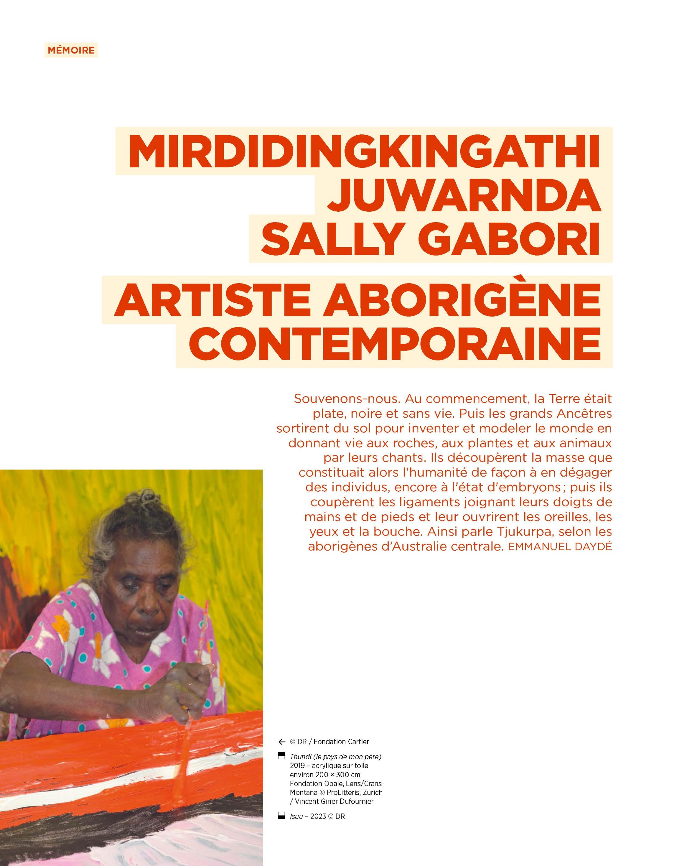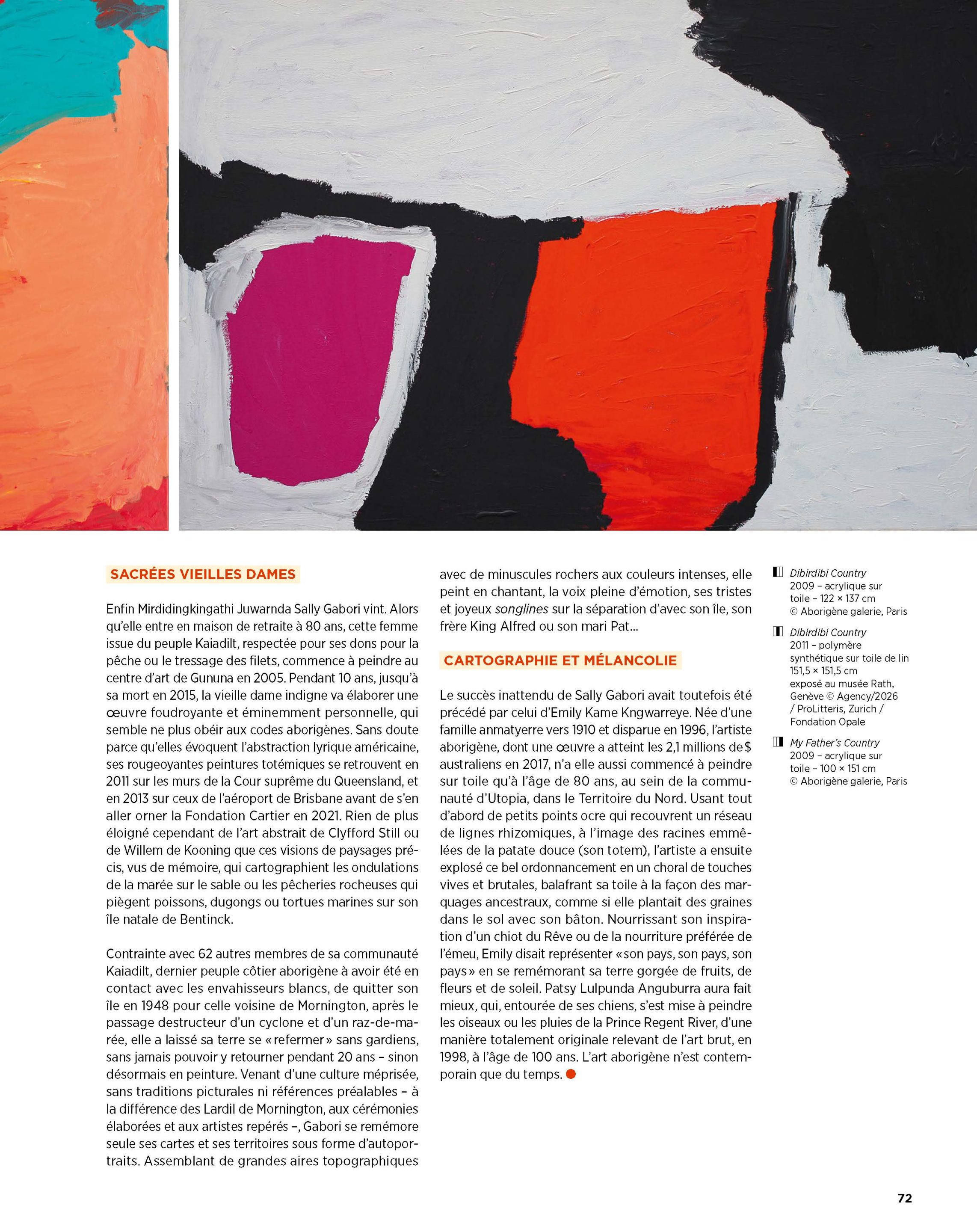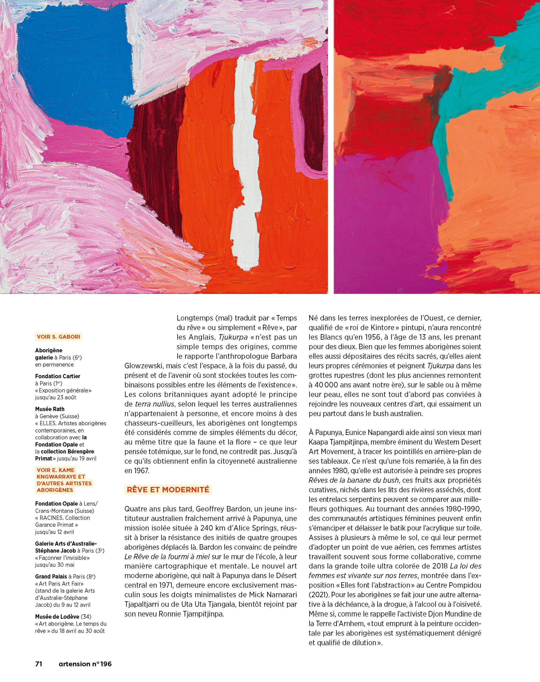 Parmi les 164 (!) expositions de ce numéro, les mythes d’Ovide de la Renaissance à l’art vidéo au Rijksmuseum d’Amsterdam, une sculptrice new-yorkaise oubliée que Pompidou-Metz ressuscite (Louise Nevelson), des pierres naturelles aux figures dessinées sans aucune main humaine, et deux Raphaëlles aux antipodes l’une de l’autre à Paris. Côté mémoire, Sally Gabori, artiste aborigène australienne qui n’a commencé à peindre qu’à 80 ans. Ce numéro déborde.