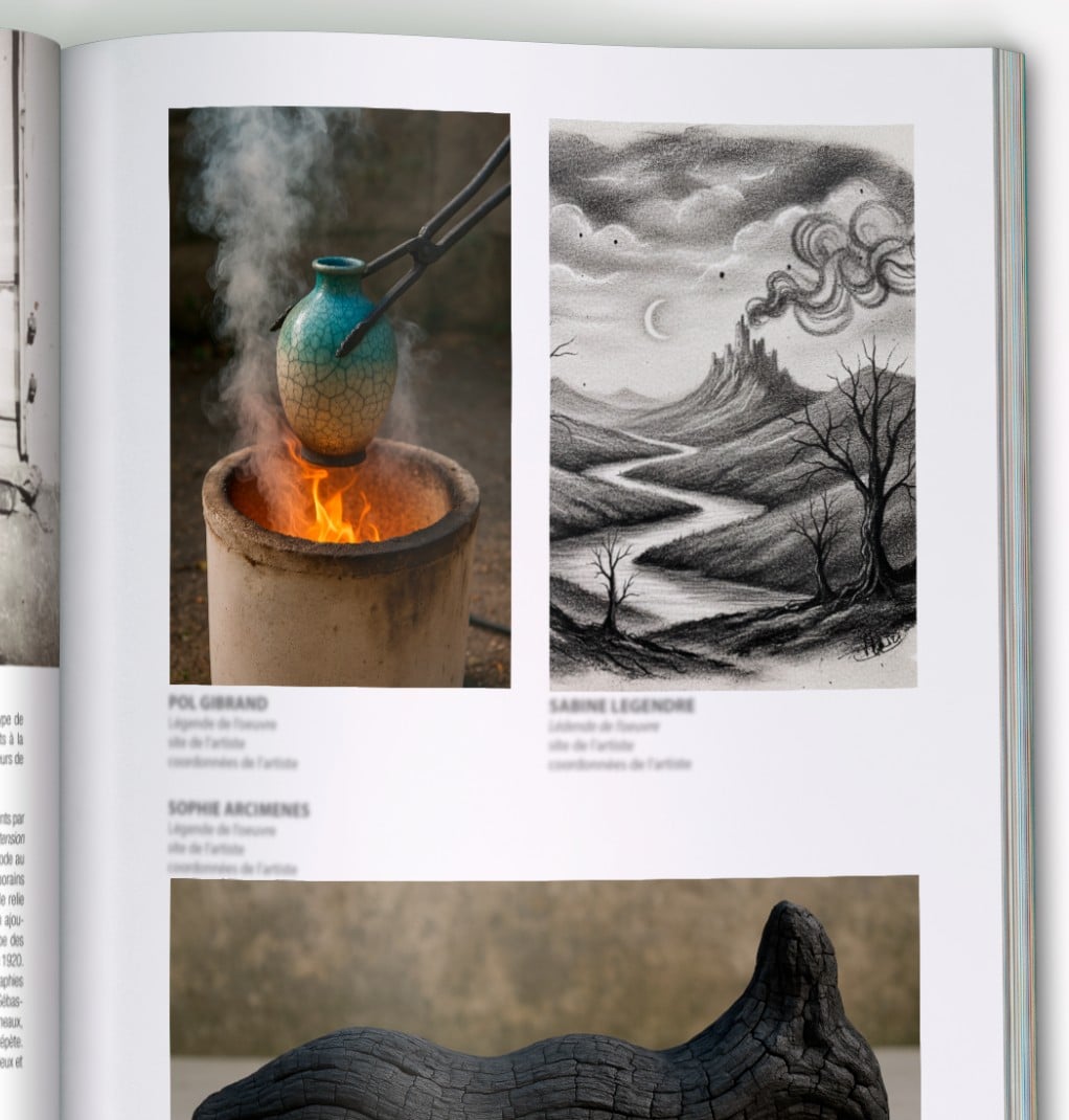 Si votre travail engage le feu — qu’il s’agisse de brûlage, de suie, de cendre, de bois calciné, de raku ou de tout autre usage créatif de la flamme — vous avez la possibilité de le faire connaître au sein du portfolio d’œuvres qui accompagnera ce dossier.