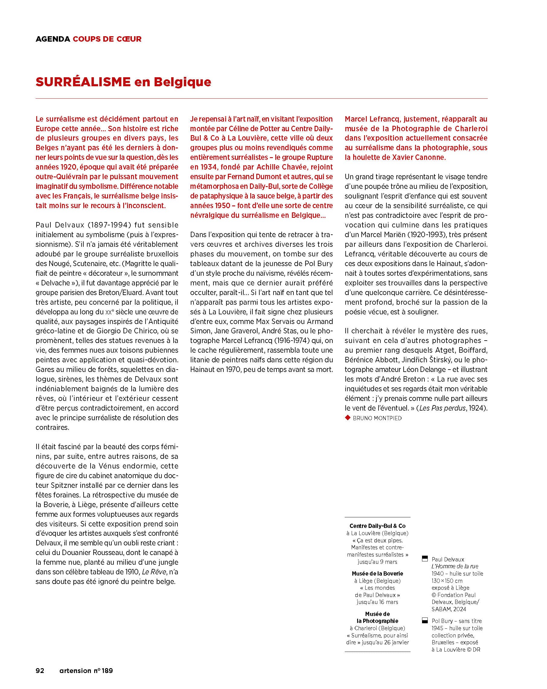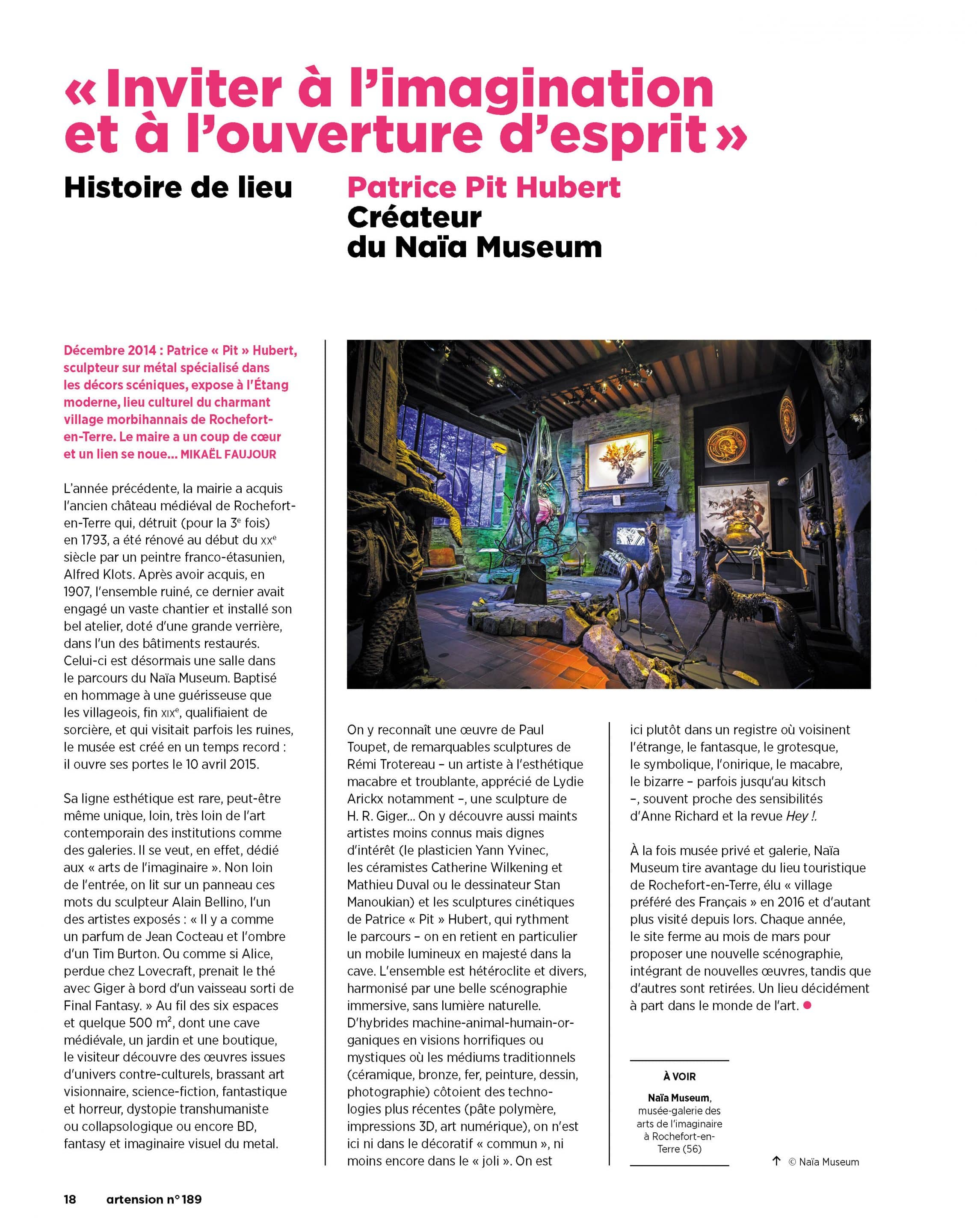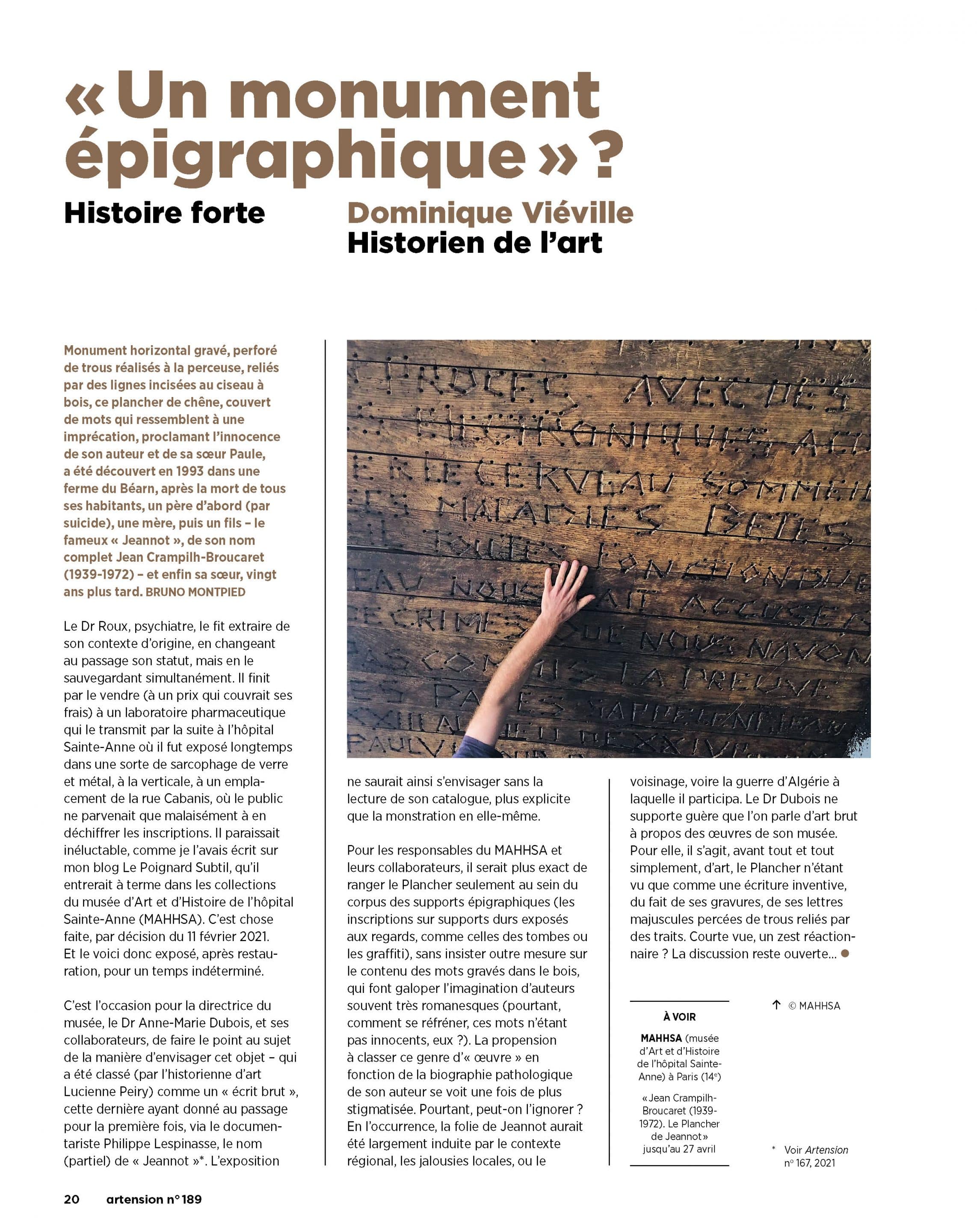 L’ancienne juriste Valérie Eymeric dirige aujourd’hui une galerie d’art à Lyon où elle expose des artistes fascinés par la couleur et le mouvement. Le collectionneur Laurent Dumas, à la tête d’une collection de 2000 œuvres, soutient activement la scène artistique française à travers diverses initiatives dont la future création d’un centre d’art sur l’île Seguin en 2026. Le Naïa Museum à Rochefort-en-Terre, ouvert en 2015, se distingue par son parcours onirique dédié aux « arts de l’imaginaire » mêlant art visionnaire, science-fiction et fantastique. Le plancher de Jeannot, découvert en 1993 dans une ferme du Béarn et couvert de messages gravés par Jean Crampilh-Broucaret, continue d’intriguer les chercheurs quant à sa nature d’œuvre d’art brut ou contemporaine. (pages 14 à 20)