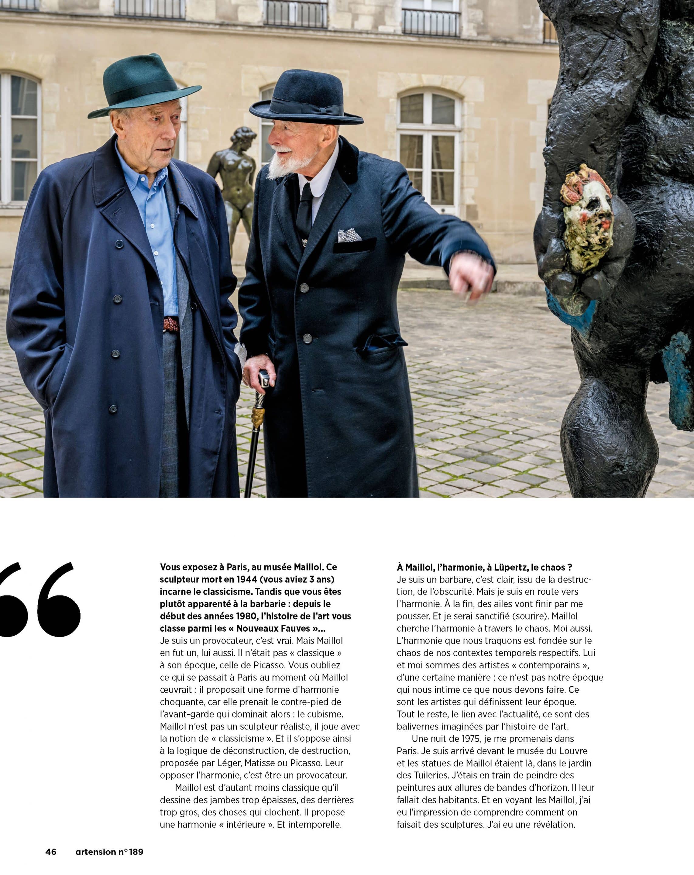 Maître en provocations assumées, le peintre-sculpteur Markus Lüpertz poursuit sa quête d’harmonie à travers le chaos. Exposé au musée Maillol, il dialogue avec le classicisme tout en revendiquant sa liberté totale d’artiste barbare. Dans cet entretien mené par Françoise Monnin et photographié par Bertrand Rieger, Lüpertz évoque avec humour son rapport à la sculpture, son indifférence à l’argent et sa fidélité de 60 ans à son galeriste Michael Werner, dans un ballet de confidences où percent son autodérision et son exigence absolue. (pages 44 à 49)