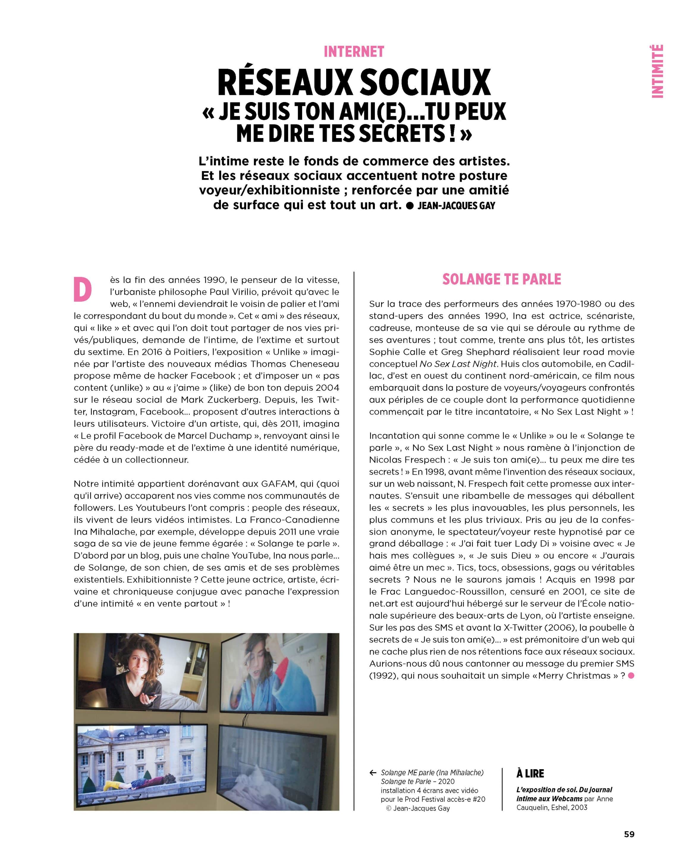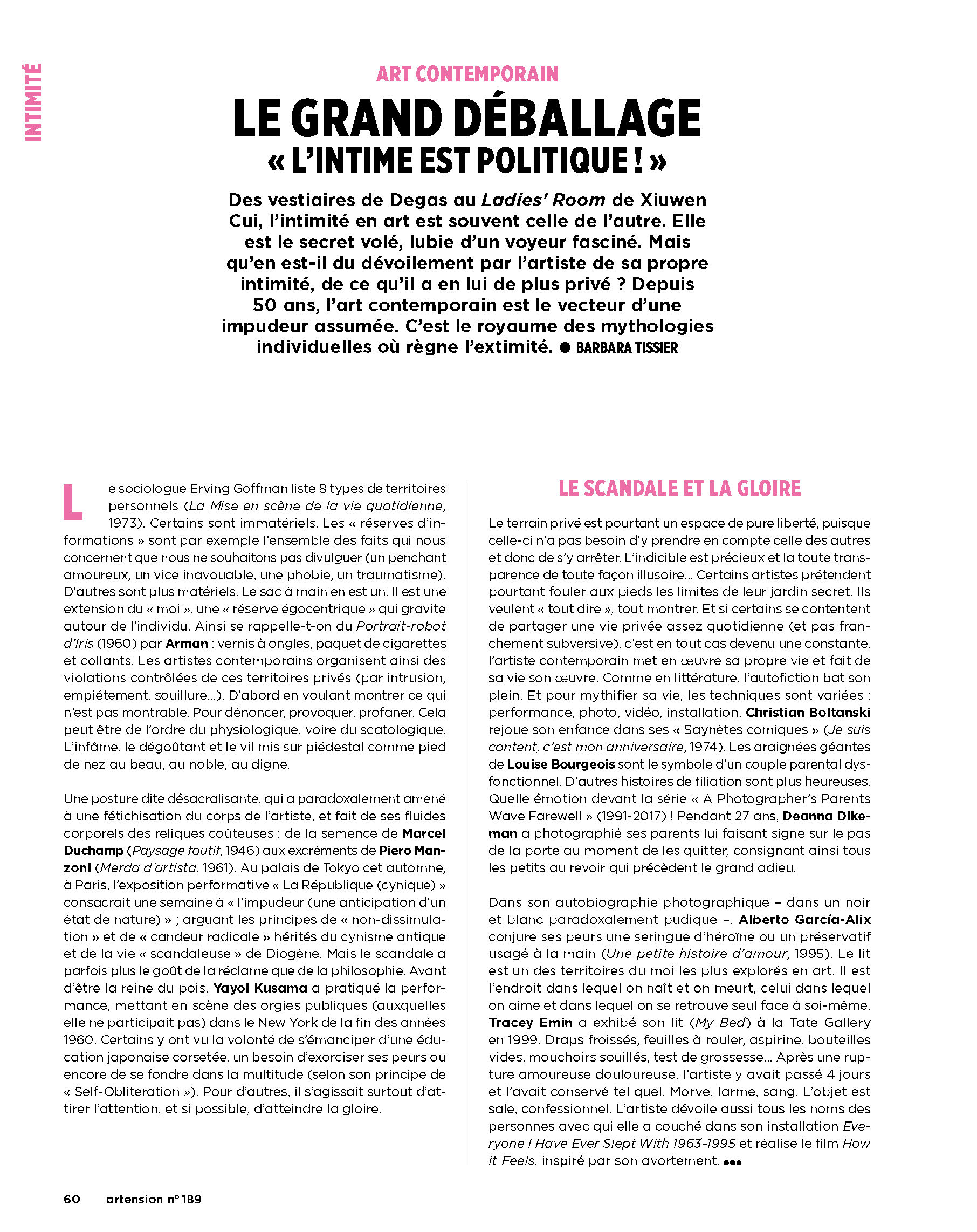 De l’intime sublimé dans les pastels de Degas aux selfies contemporains, des vestiaires de Cui Xiuwen aux chambrettes de Rosa Bonheur, les artistes révèlent la complexité de nos rapports à l’intime, entre confessions publiques assumées des uns et secrets jalousement gardés des autres, entre exhibitionnisme et pudeur. (pages 52 à 72)